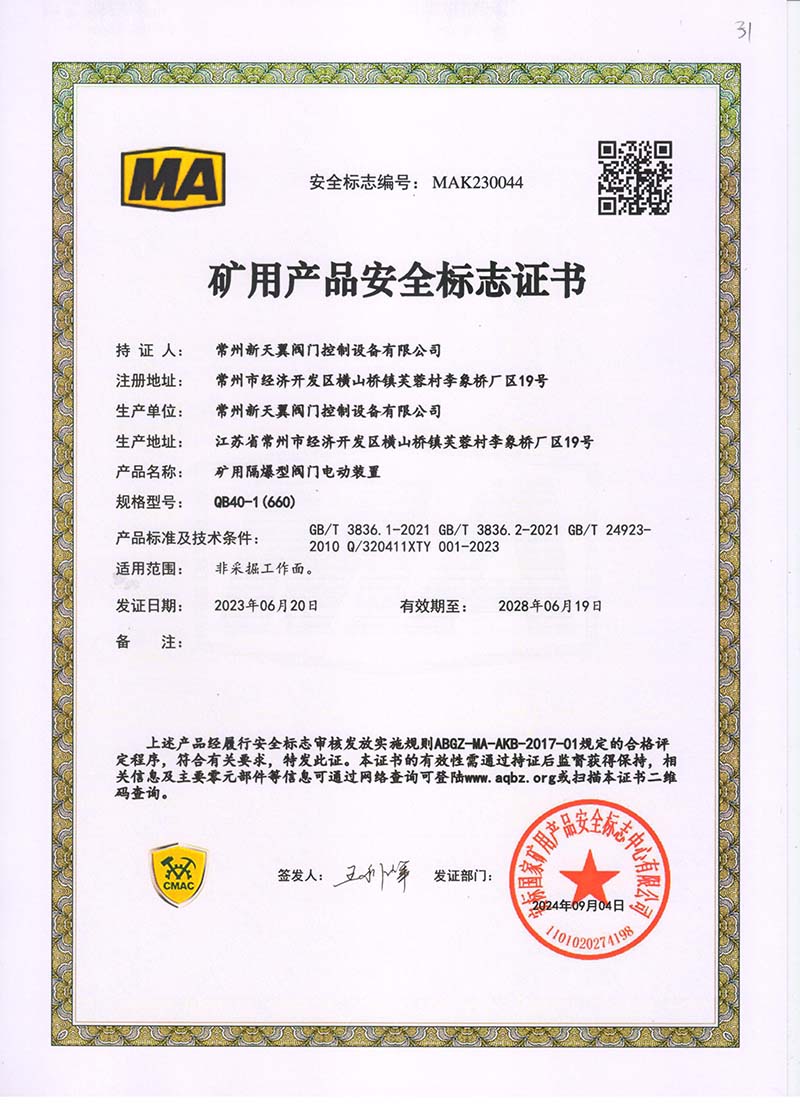 礦用產(chǎn)品安全標(biāo)志證書ZJK60-24(660)