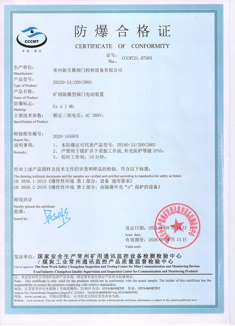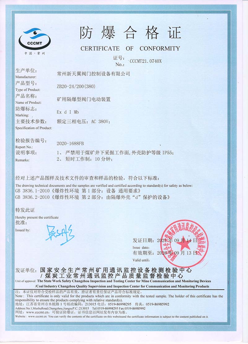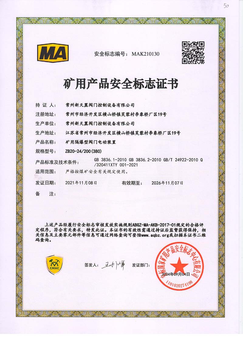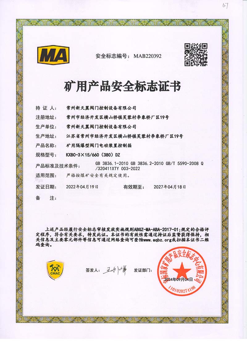礦用產(chǎn)品安全標(biāo)志證書ZB60-24 200(380)