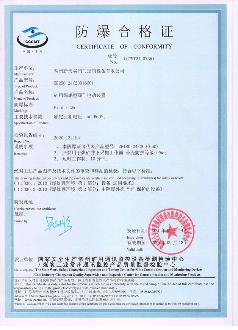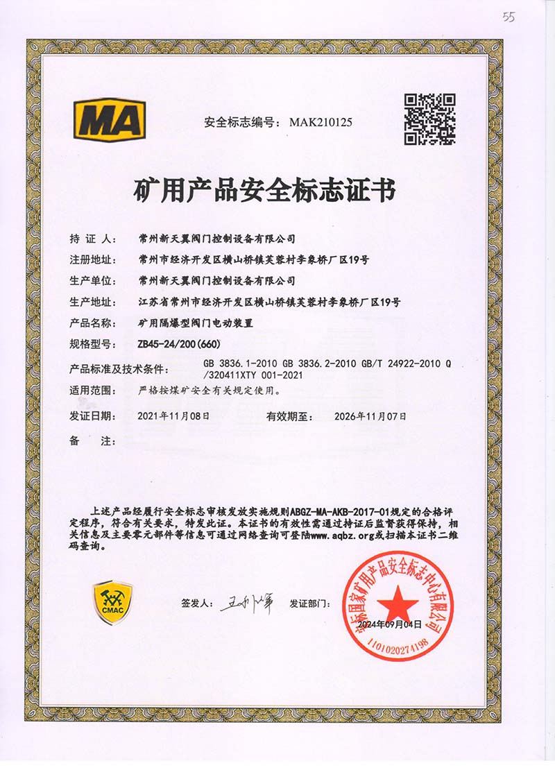礦用產(chǎn)品安全標(biāo)志證書ZB30-24 200(660)