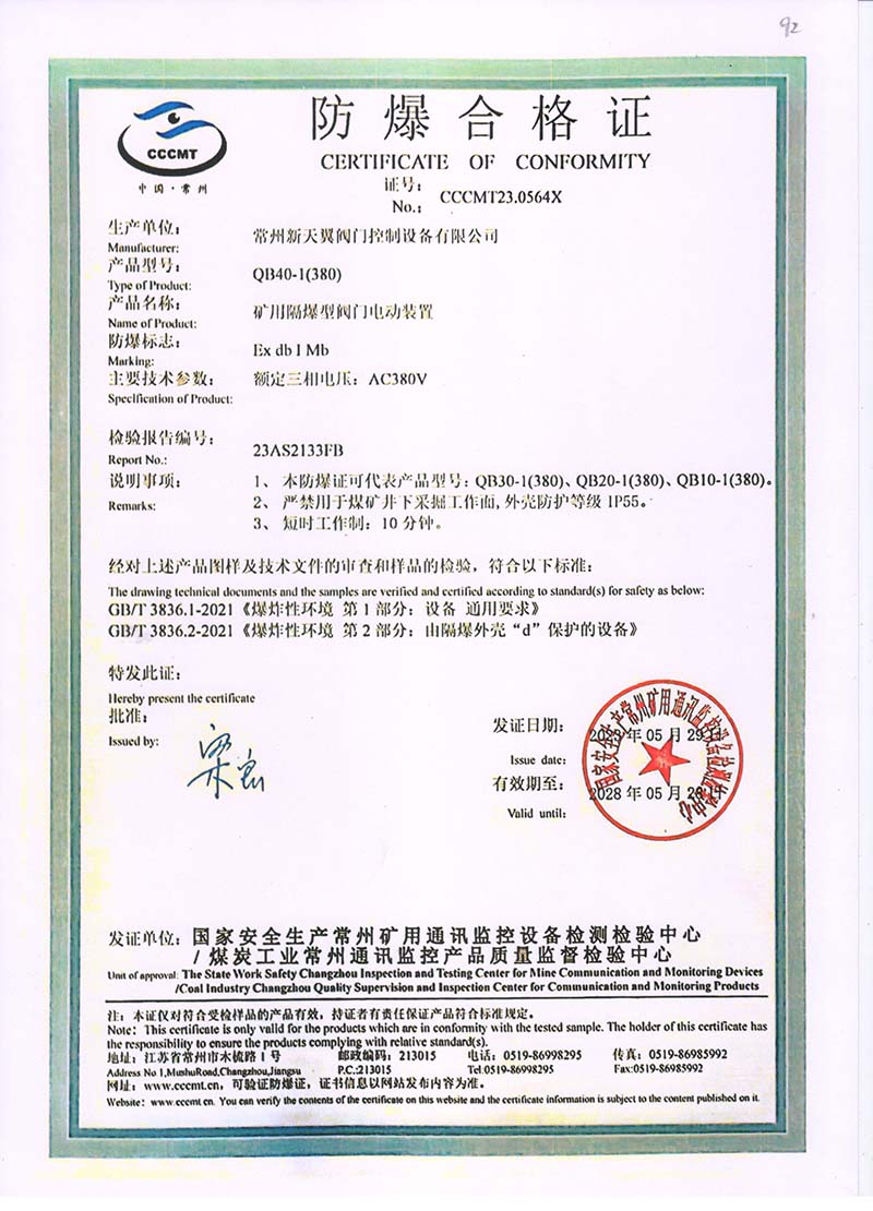 礦用產(chǎn)品安全標(biāo)志證書QB40-1(380)