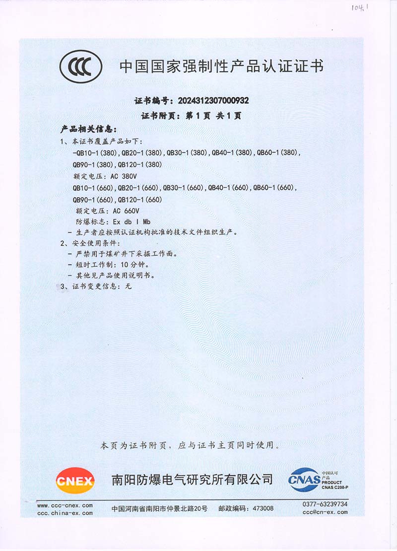 礦用隔爆QB(380V 660V) 國家強(qiáng)制性產(chǎn)品認(rèn)證證書104.1